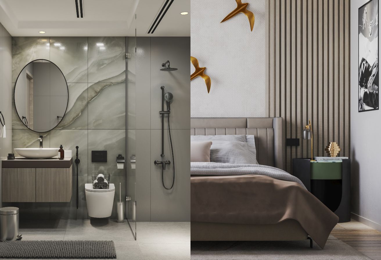 The bedroom is spacious and well-appointed, designed to serve as a private retreat. It includes built-in wardrobes, ample storage, and large windows that invite natural light, enhancing the sense of openness and calm. The bathroom reflects modern sophistication with elegant fixtures and a clean, contemporary design.